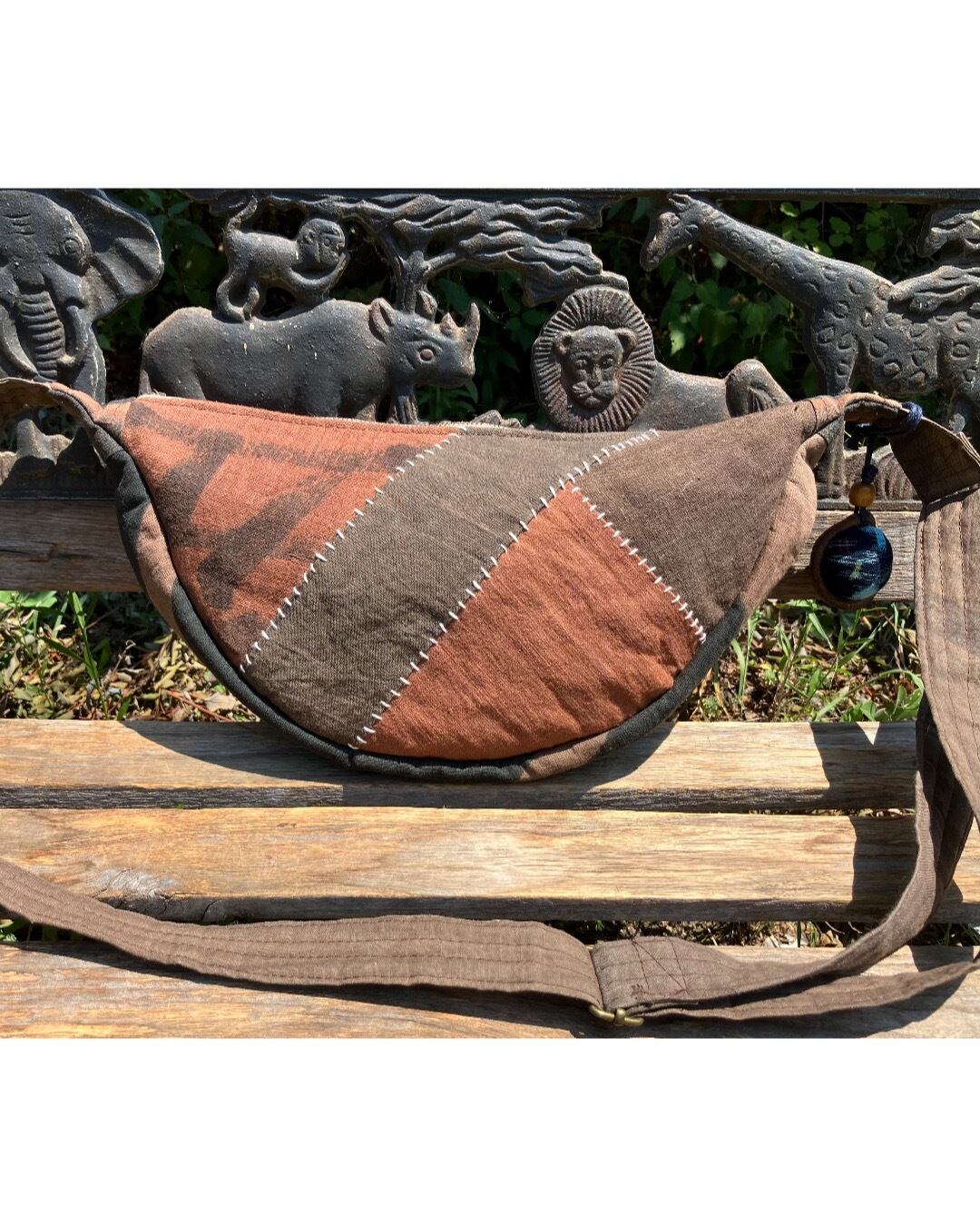 色々な柿渋染めと鉄媒染をした旗のミニショルダーバッグを作りました。