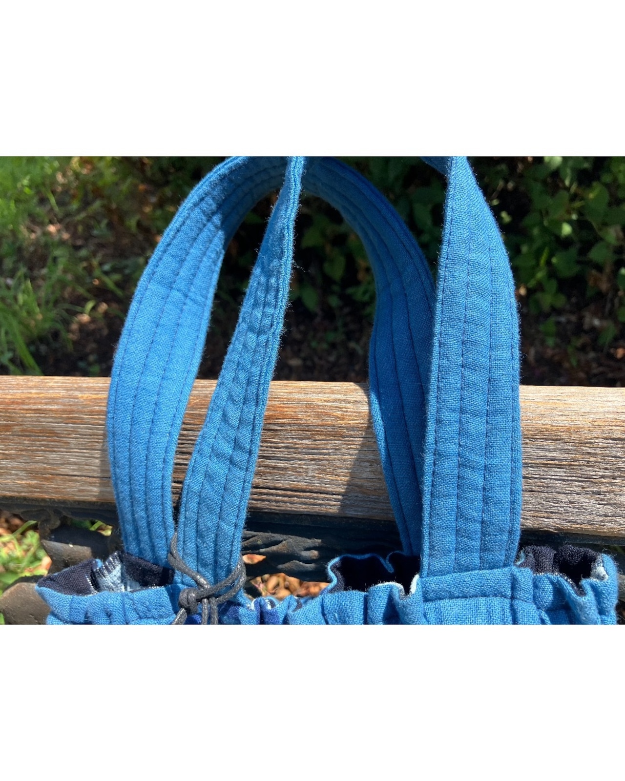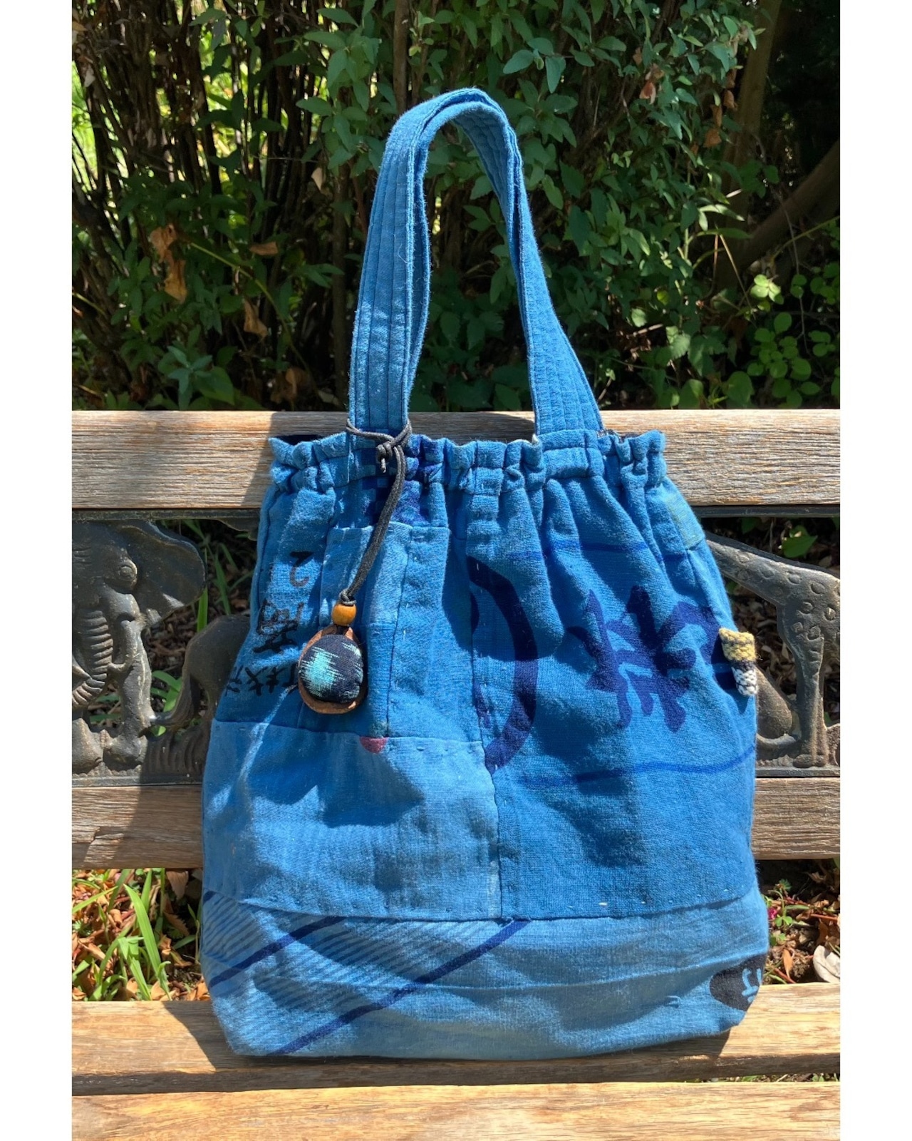 藍染めをした色々な手ぬぐいを接ぎ合わせてゴム口巾着風バッグを作りました。