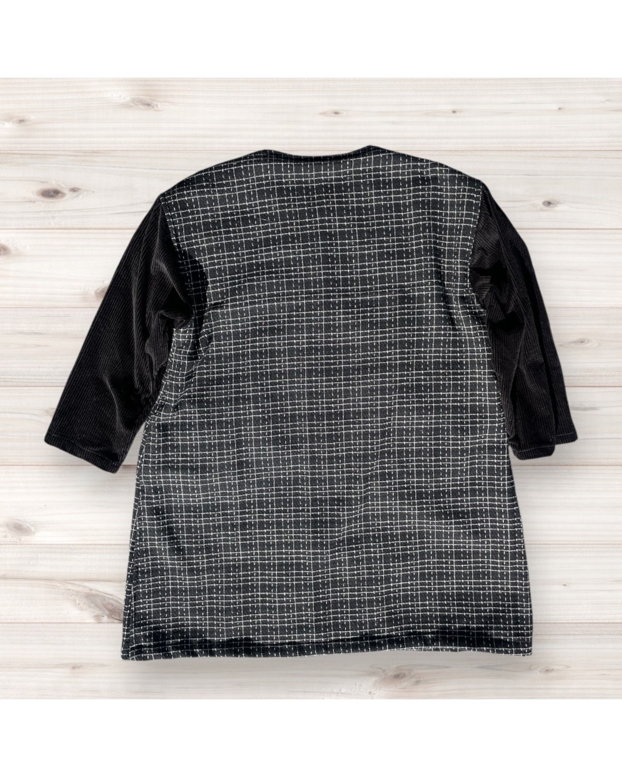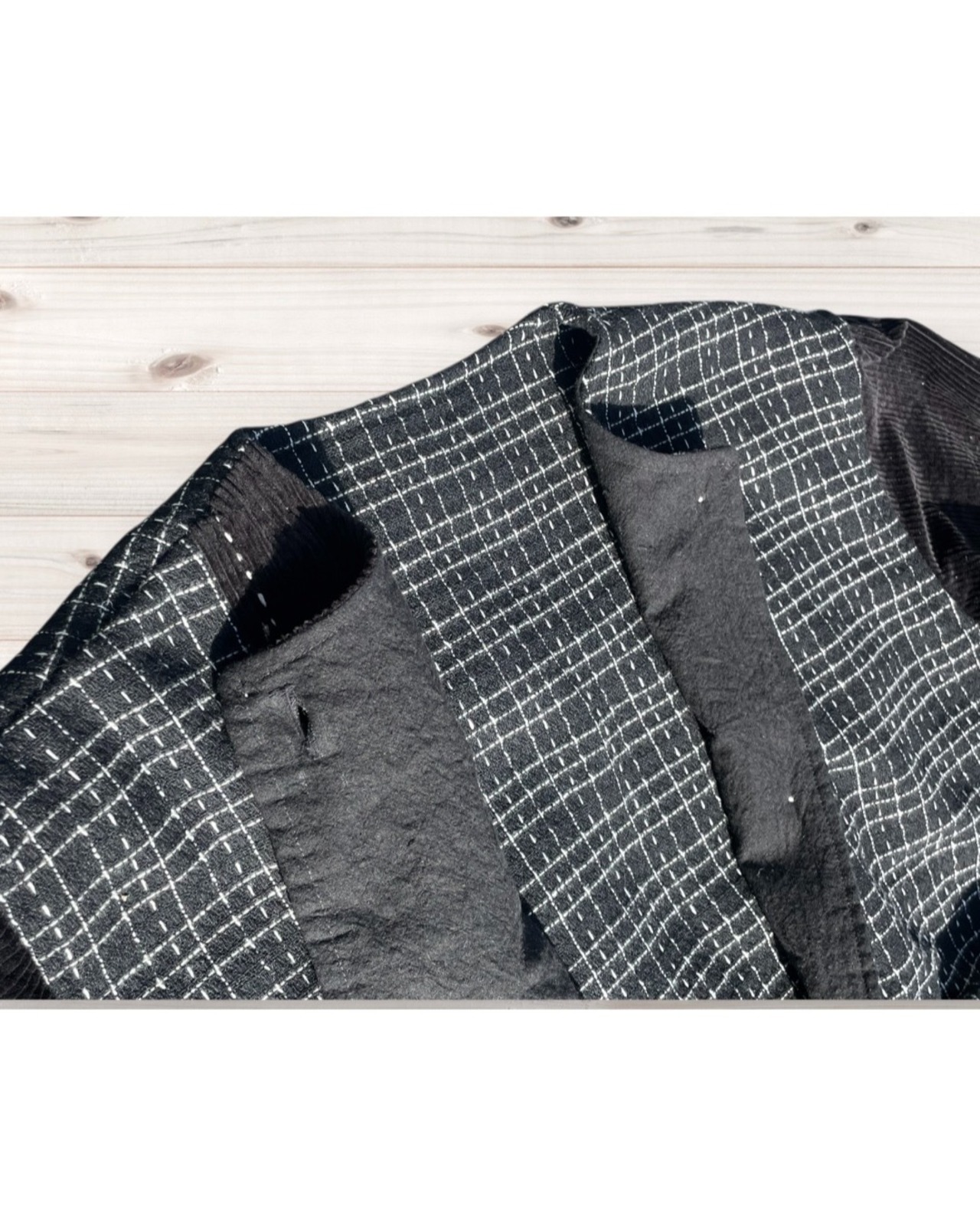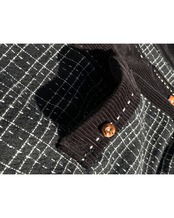 黒チェック柄のノーカラーコートです。