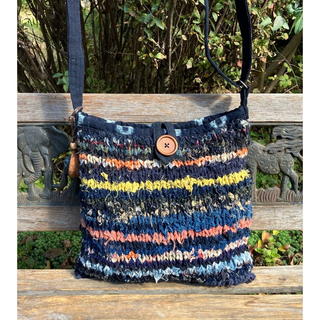 色々な古布を裂いて編んだ斜め掛けショルダーバッグです。
