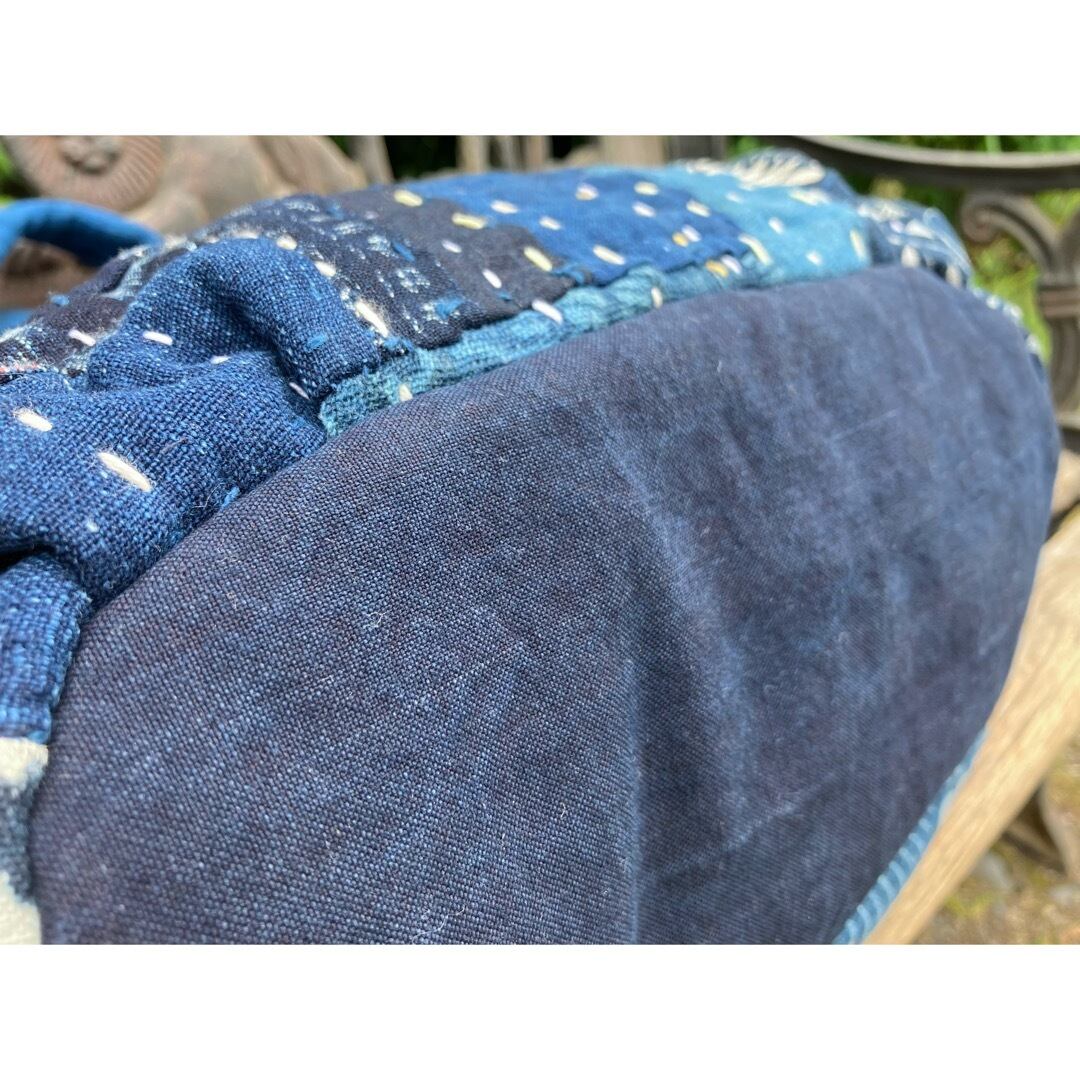 色々な型染めや絣を接ぎ合わせて刺し子をした楕円底トートバッグです。
