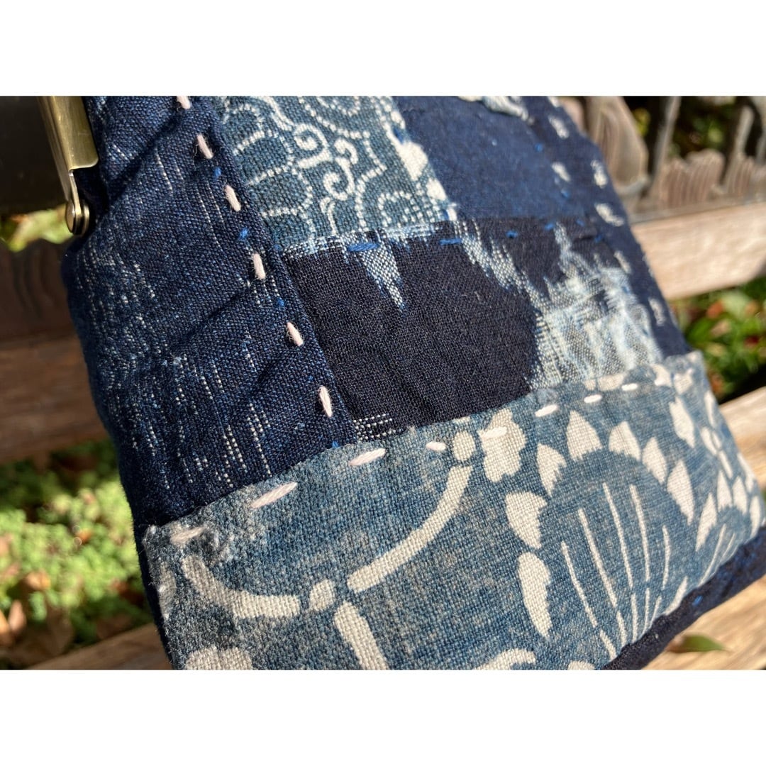 色々な古布を接ぎ合わせたがま口のスマホショルダーです。